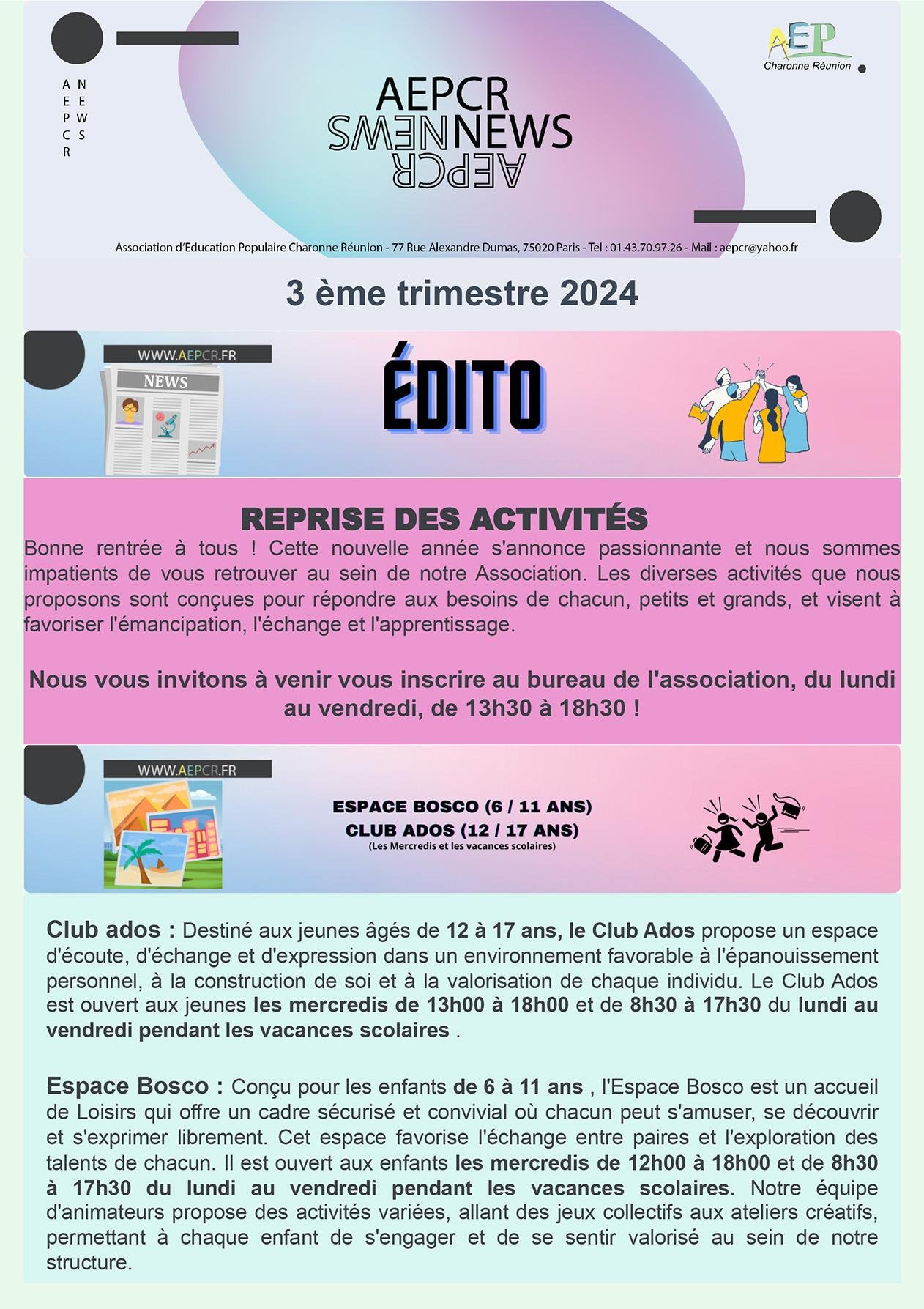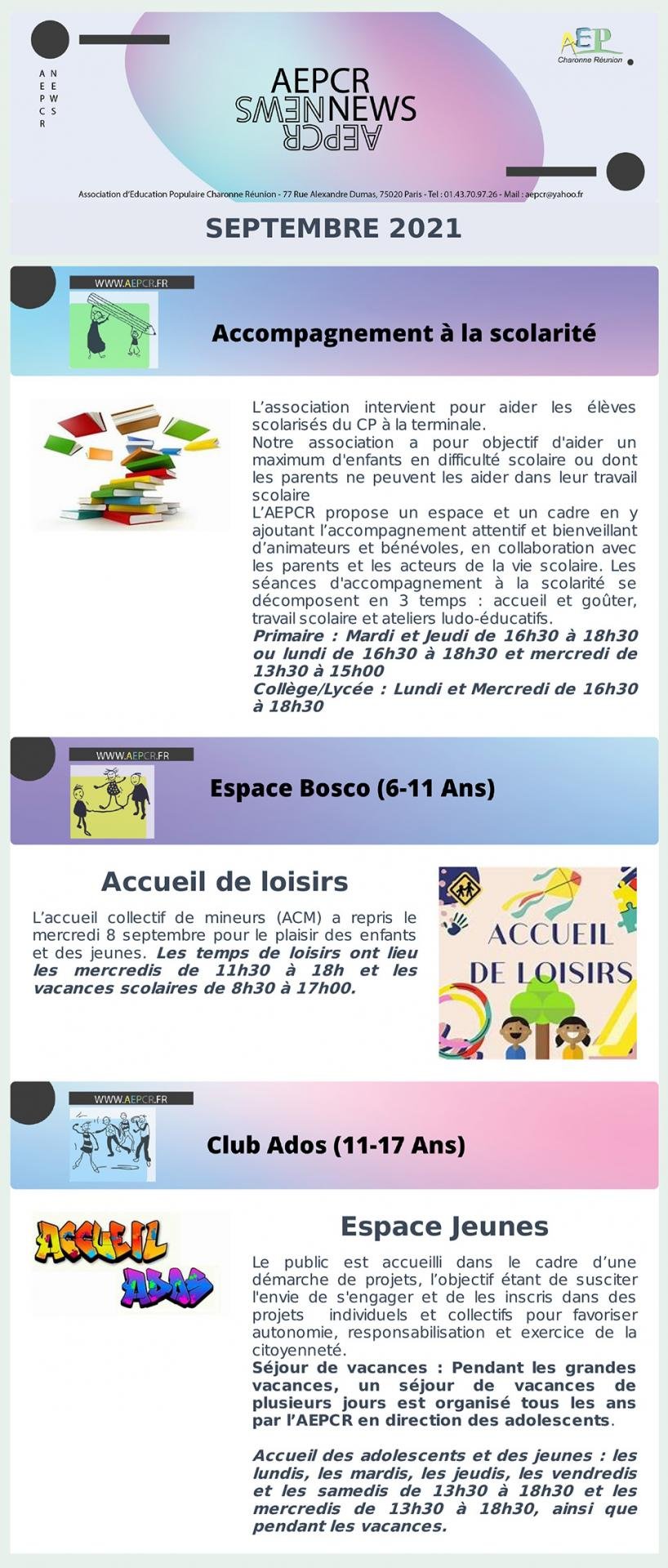 - Septembre – Accompagnement à la scolarité, Espace Bosco et Club ados