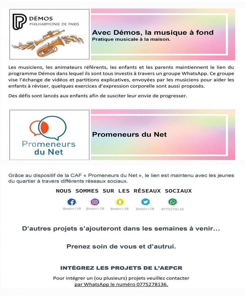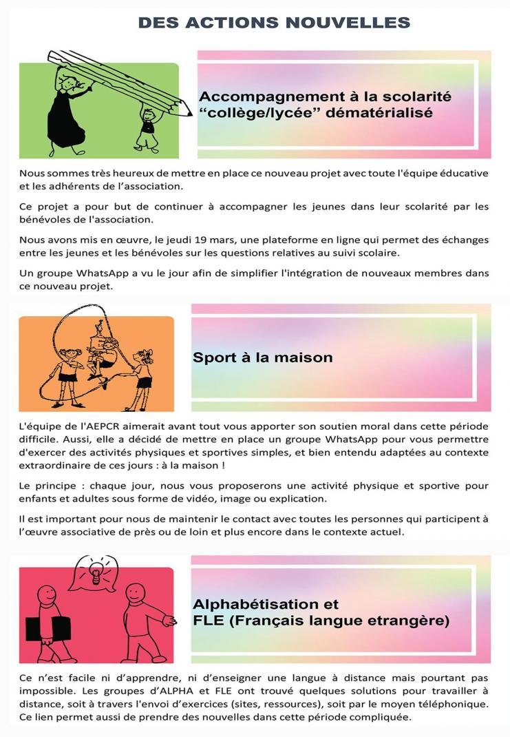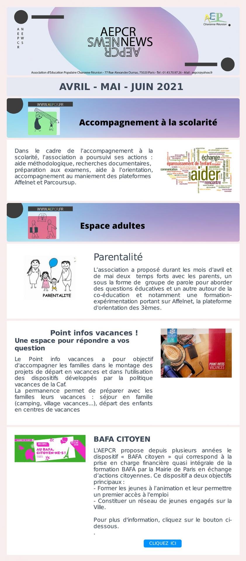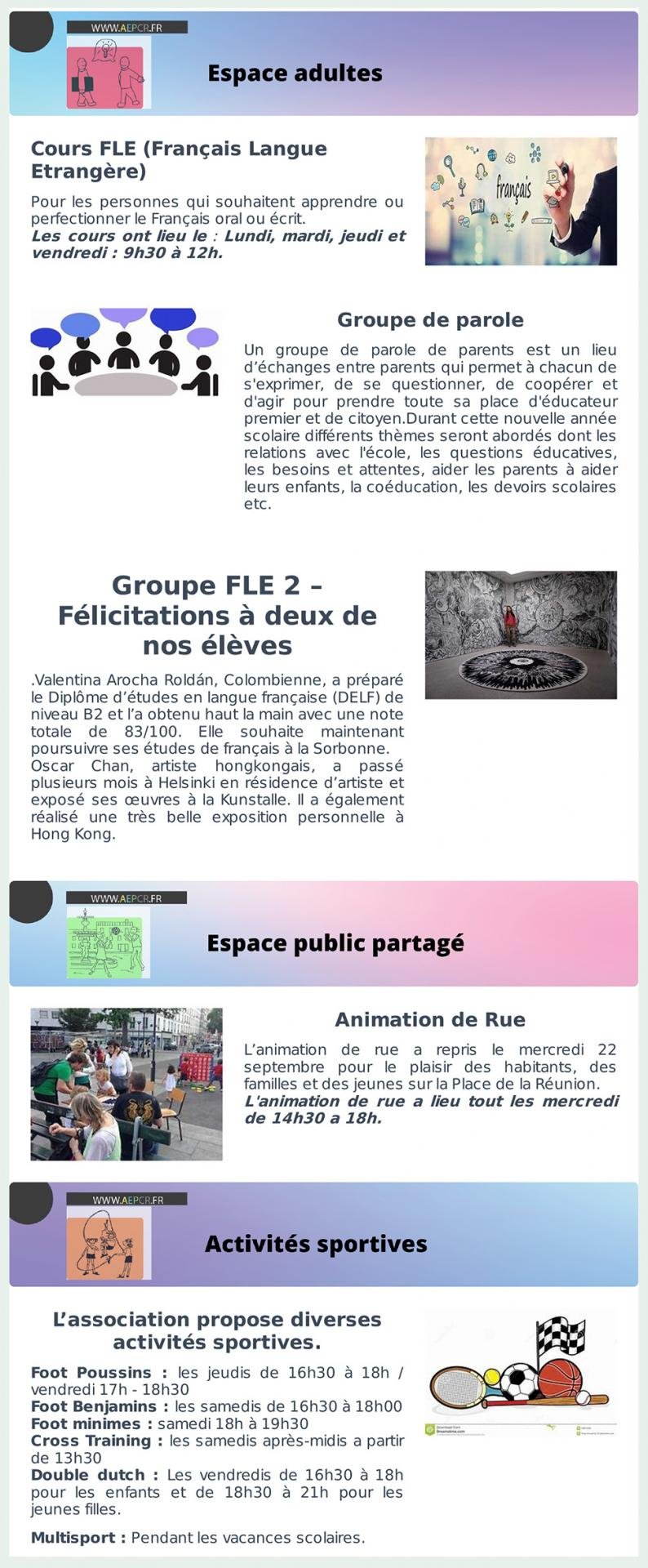 - Avril / Mai / Juin – Accompagnement à la scolarité et Espace adultes