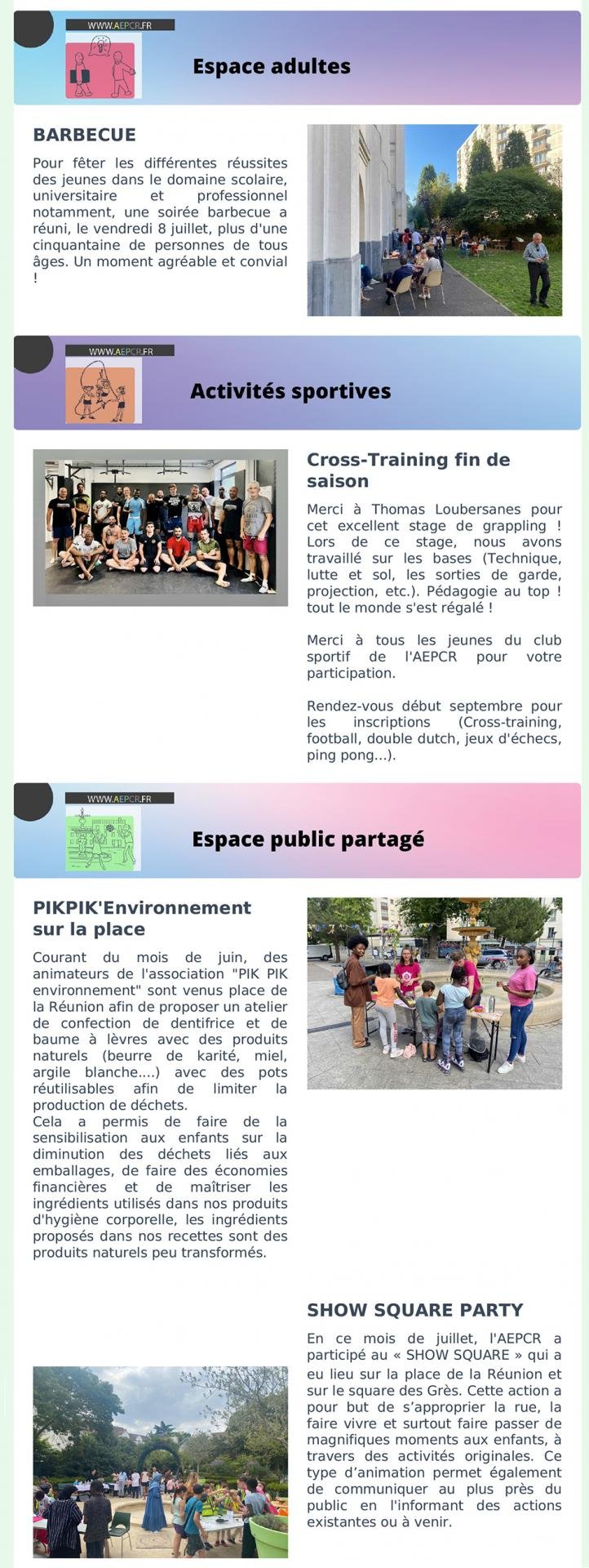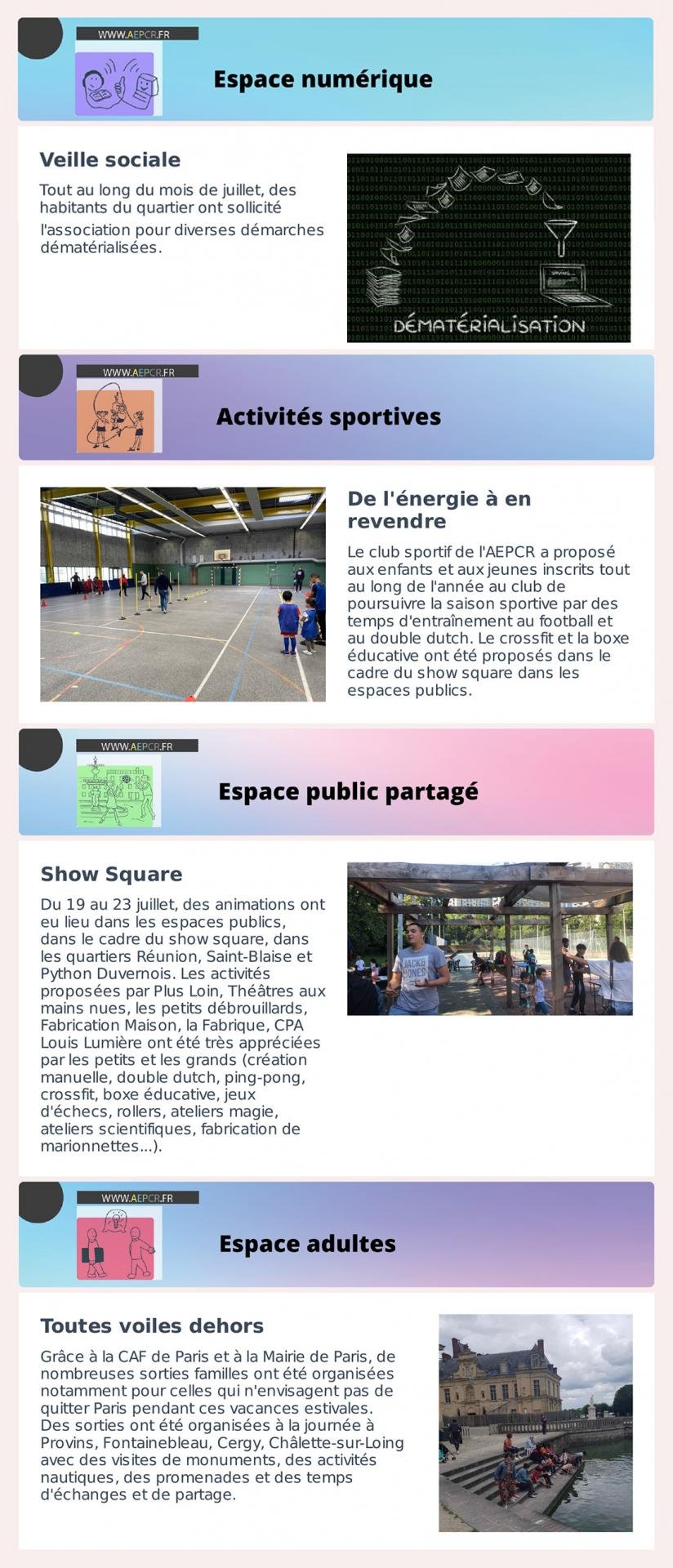 - Juillet – Espace numérique, Activités sportives, Espace public partagé et Espace adultes