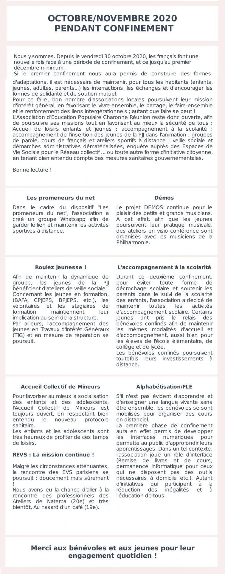 - Octobre / Novembre / Décembre – Espace public partagé, Activités sportives et Engagement, Bénévolat, Citoyenneté