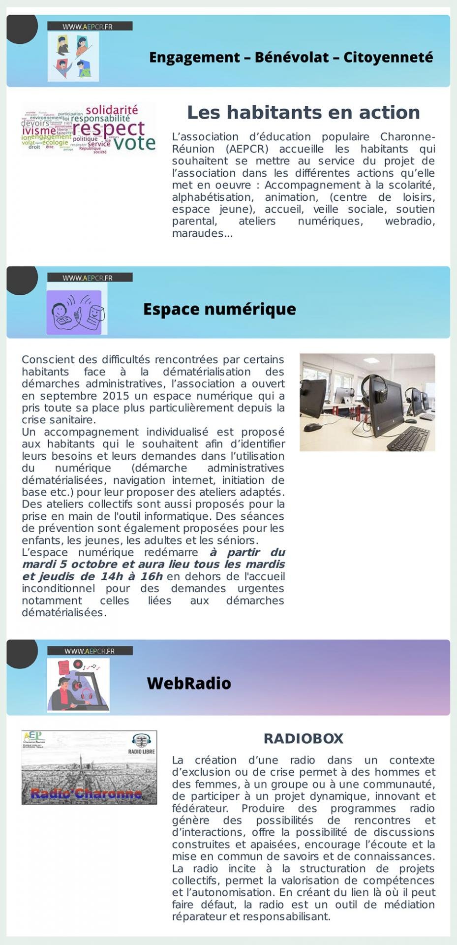 - Septembre – Engagement, Bénévolat, Citoyenneté, Espace numérique et WebRadio